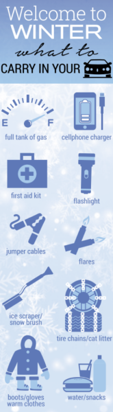 6. Prepare a winter survival kit – Pack the items in graphic to help you endure an emergency or road closure until help arrives.